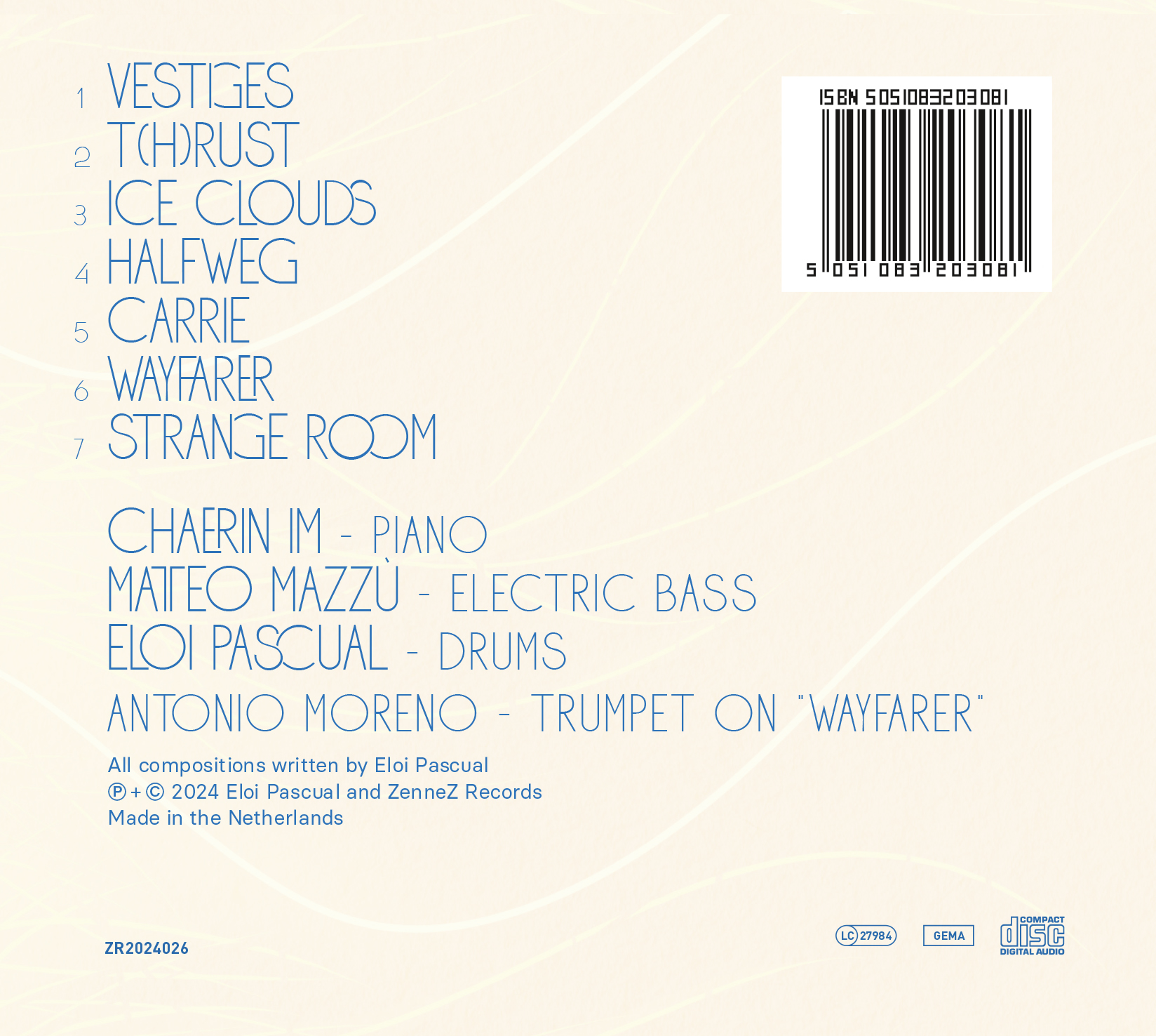 Ein junger spanischer Schlagzeuger und Komponist mit Wohnsitz in Amsterdam. Sein Weg führte Eloi Pascual seit seinem 16 Lebensjahr von Metal/Hardrock über klassische Musik bis hin zum Jazz. Absolut delikate Kompositionen und sehr empathisch arrangiert.