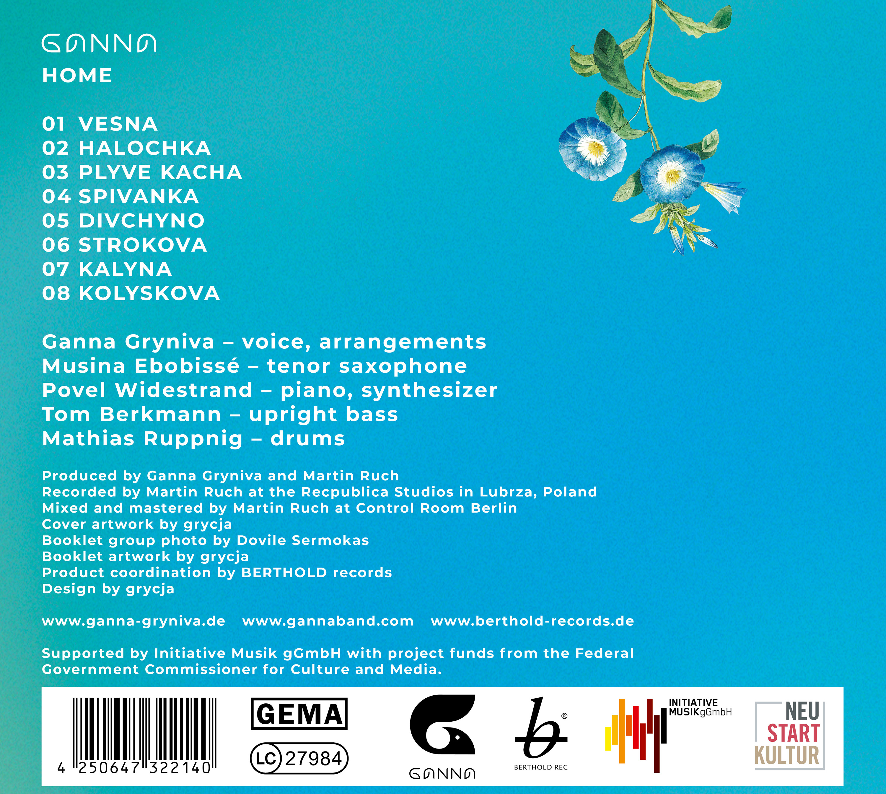 So klingt Home – das neue Album der Band GANNA um Sängerin und Bandleaderin Ganna Gryniva. Die gebürtige Ukrainerin kam 2002 im Alter von 13 Jahren mit ihren Eltern nach Deutschland. Mit ihrer markanten, ausdrucksstarken Stimme nimmt sie uns mit auf sehr persönlich und politisch gefärbte Reise. „Ich bin in die Ukraine gereist, um landeskundliche Archive zu besuchen und um alte, traditionelle Lieder zu sammeln“, erklärt Gryniva und ergänzt: „Die Reise führte mich durch wunderschöne Berglandschaften in den Karpaten, in alte Kirchen, auf kleine, stimmungsvolle Musik-Festivals und zu besonderen Menschen.“