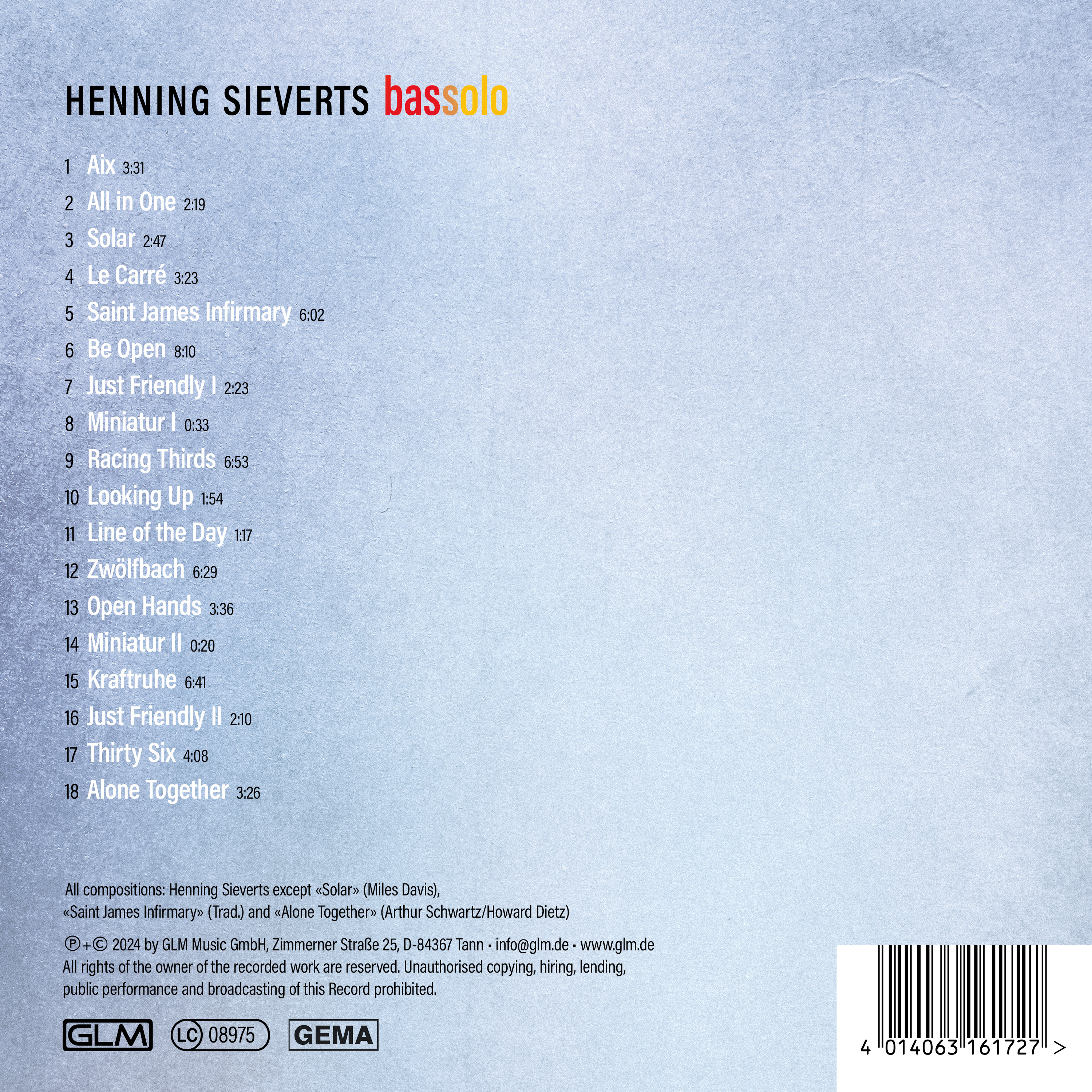 Das Album „Bassolo“ entstand in der beeindruckenden Akustik der Münchner Auferstehungskirche. Alle Stücke der Aufnahme sind in einem Notenheft „Henning Sieverts: Bassolo“ zusammengefasst, in je zwei Versionen: gezupft und gestrichen, mit und ohne Impro-Teilen.