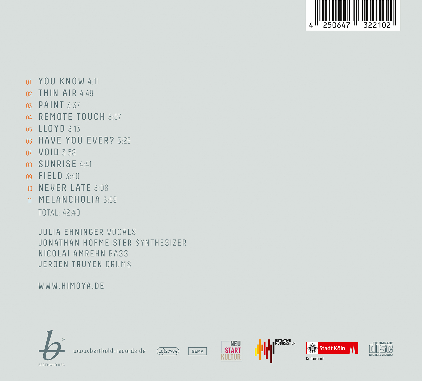 Nicolai Amrehn und Jeroen Truyen legen am Bass und Schlagzeug mehr als nur die Grundlagen für das alles, sondern stellen die Verbindung zwischen Pop und Jazz her. Man realisiert erst beim zweiten oder dritten Hören wie rhythmisch ideenreich es ist, was die Rhythmussektion hier veranstaltet – hier ein Stolpern, da eine kurze Improvisation. Der Popentwurf von Himoya lebt von den zahlreichen musikalischen Details, in denen der verborgene Teil der Schönheit dieser Musik steckt.