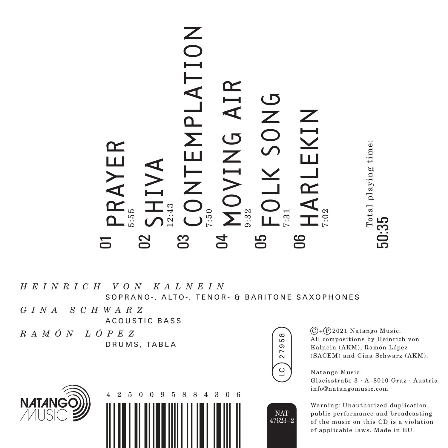 All compositions by Heinrich von Kalnein (AKM), Gina Schwarz (AKM) und Ramón Lopez (SACEM).