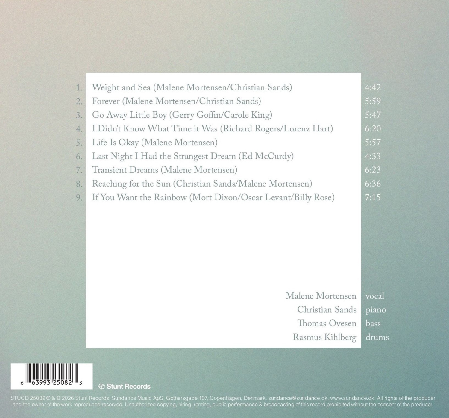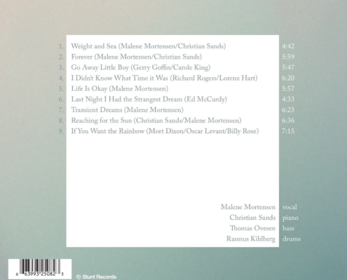 Malene Mortensen (vocal), Christian Sands (piano),Thomas Ovesen (bass), Rasmus Kihlberg (drums). Guests: Villads Littauer Bendixen (violins), Lara Biancalana (cello), Mathias Heise (Harmonica), Benny Benack III (trupet), Gabor Bolla (tenorsas), Eliel Lazo (perc).