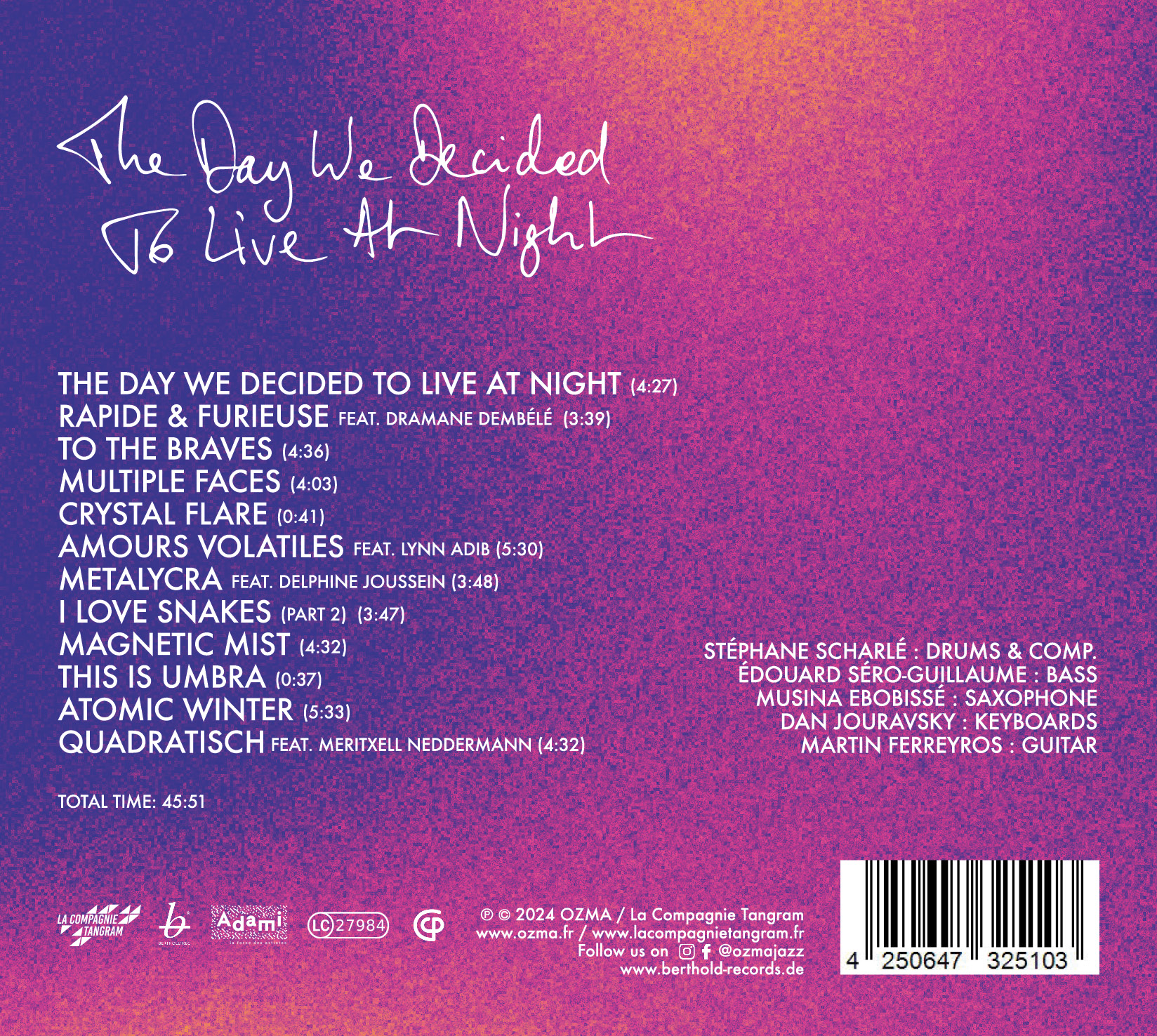 Nach fünf Jahren ohne Album kehrt OZMA mit THE DAY WE DECIDED TO LIVE AT NIGHT zurück – einem zutiefst persönlichen Album des Schlagzeugers und Bandleaders Stéphane Scharlé, das einen Wendepunkt in der Geschichte der Band markiert. Paradoxerweise ist dieses Album, obwohl es Stéphane Scharlés persönlichstes Werk als Komponist ist, zugleich das, auf dem die meisten Kollaborationen mit anderen Künstler:innen zu finden sind. Gemeinsam mit seinem langjährigen Weggefährten, dem Bassisten Édouard Séro-Guillaume, hat er ein neues Team versammelt, eine musikalische Frischzellenkur: Musina Ebobissé am Saxophon, Martin Ferreyros an der Gitarre und – neu im Instrumentarium – Dan Jouravsky an den Keyboards, die die Posaune ersetzen.