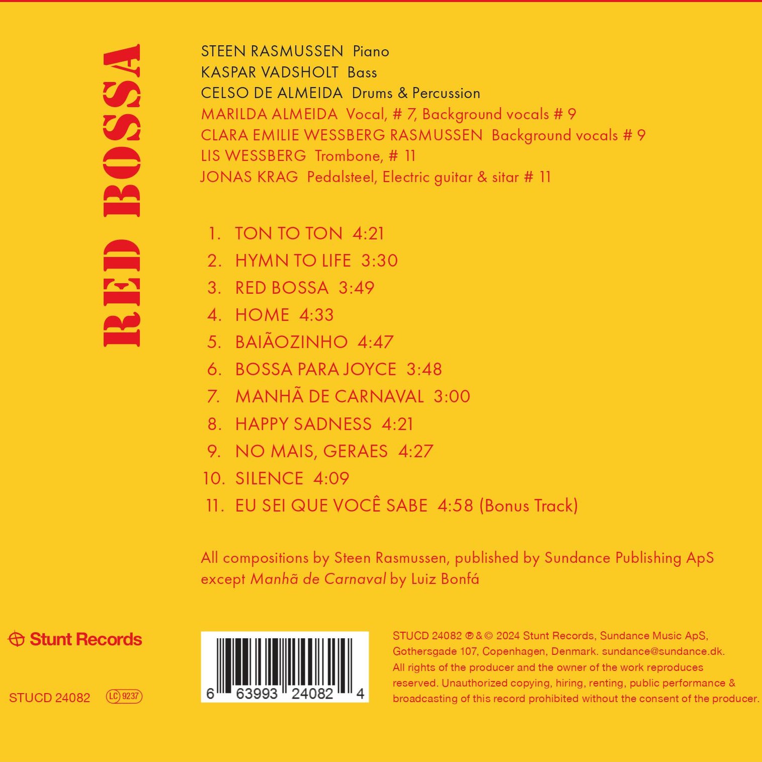 RED BOSSA was recorded in Copenhagen and cements Steen Rasmussen’s crucial role as Denmark’s leading interpreter of Brazilian music. Since his first introductions to Bossa, Samba, and the other sub-genres from the great South American country and culture, he’s dared to dive headfirst into things – fully committed and without a safety net.