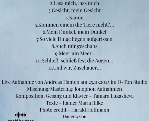 Die Idee zum Album entstand im Sommer 2025 mit der Vertonung des Gedichts ‚Mein Dunkel, mein Dunkel, da steh ich mit dir …‘. ‚Ein Ausschnitt daraus ist in alle Richtungen gewachsen und bildet dabei das Zentrum des Stücks. Die Klavierbegleitung schwebt zwischen unterschiedlichen musikalischen Welten, ist aber immer dem Wort untergeordnet, unterstützt es und verstärkt es. Und obwohl das Programm nur zusammen und in dieser Reihenfolge Sinn ergibt und eine Geschichte erzählt, bestehen die einzelnen Stücke für sich,‘ sagt Tamara Lukasheva.